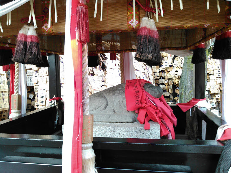 境内の北西角、鳥居が目印の絵馬掛書の奥に「なでると一つだけ願いがかなう」という「牛」が祀られる牛舎があります。『北野天満宮
